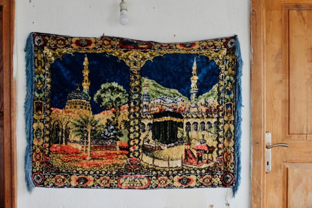 Produkte: gemusterte Teppiche, Textilien, Körbe als Aufbewahrung.